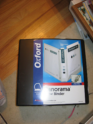 If you are more of a binder than a box person, you may choose to do what I do and get a 3” 3-ring binder and trading card plastic inserts. I was able to pick up a 3” binder at Walgreens for $3 and the trading card inserts at Wal-Mart for $.75 per 9-pack. Here are some pictures of what I use.